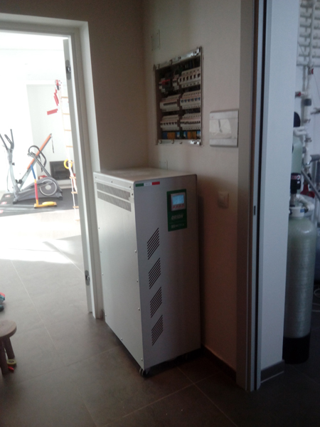мощность 12 кВт, входное напряжение 135 - 290 В, выход однофазный (220В ± 1,4%), тип электронный, вес 95 кг, габариты 420x408x910 мм